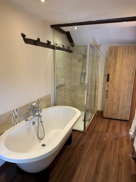 Two bedrooms: 1 x super king zip/link, (can be singles on request) and 1 super king double with en-suite. Bathroom with bath, separate shower, basin and WC. Ground floor basin and WC. Kitchen with dining area. Sitting room with electric smoke effect woodburning stove.